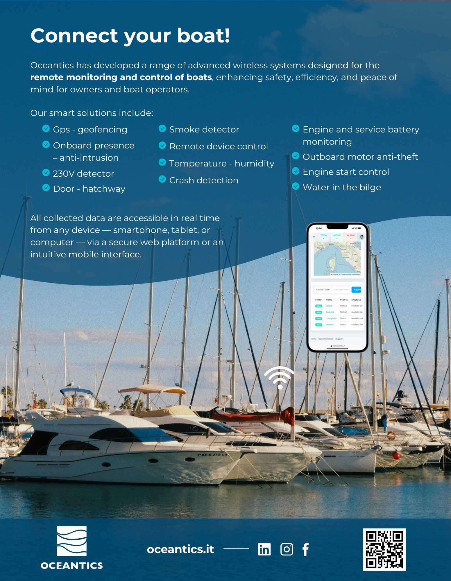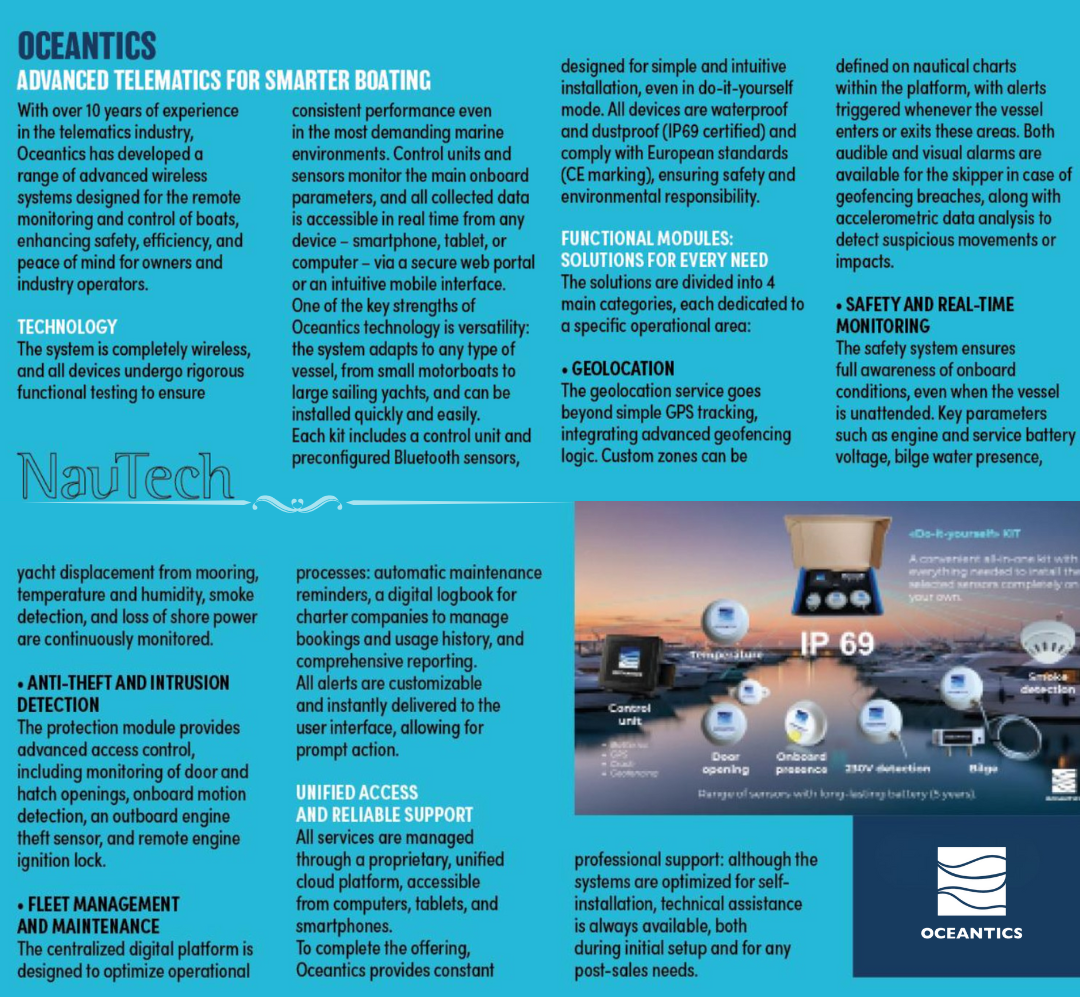 The security system developed by Oceantics enables continuous and remote monitoring of the yacht's status, offering comprehensive oversight even in the absence of physical presence on board. Thanks to a network of integrated sensors, the system can detect real-time anomalies such as: